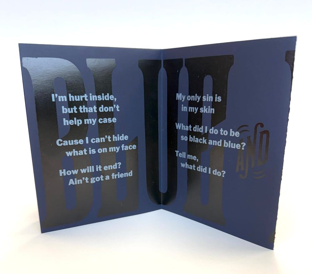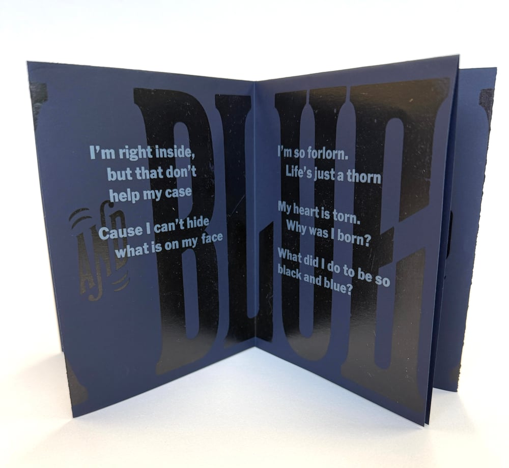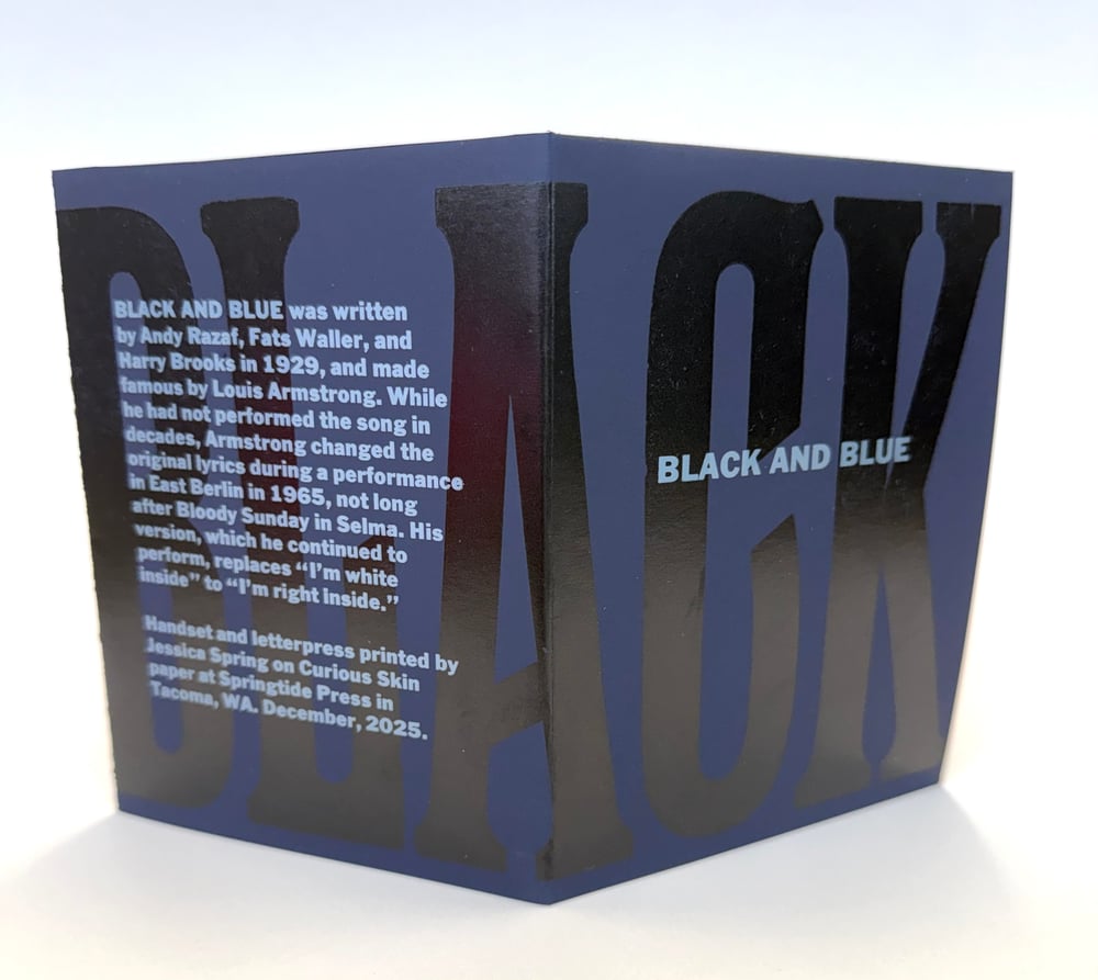"Black and Blue" was written by Andy Razaf, Fats Waller, and Harry Brooks in 1929, and made famous by Louis Armstrong. While he had not performed the song in decades, Armstrong changed the original lyrics during a performance in East Berlin in 1965, not long after Bloody Sunday in Selma. His version, which he continued to perform, replaces "I'm white inside" to "I'm right inside." Handset and letterpress printed with wood and metal type on Curious Skin paper. Created as a limited edition zine, this was printed on one side, then folded to 4.25 x 5.5 inches.